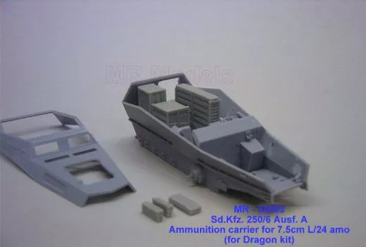 Detaillierter Resin-Umbausatz zur Darstellung des Sd.Kfz.250/6 Ausführung B, Munitionspanzerwagen für die 7,5 cm StuK L/43 und L/48. Der Bausatz wurde speziell für den Dragon Sd.Kfz.250 überarbeitet, kann aber auch mit dem TAMIYA Modell in Kombination mit dem separat erhältlichen Umbausatz MR-35041 verwendet werden.