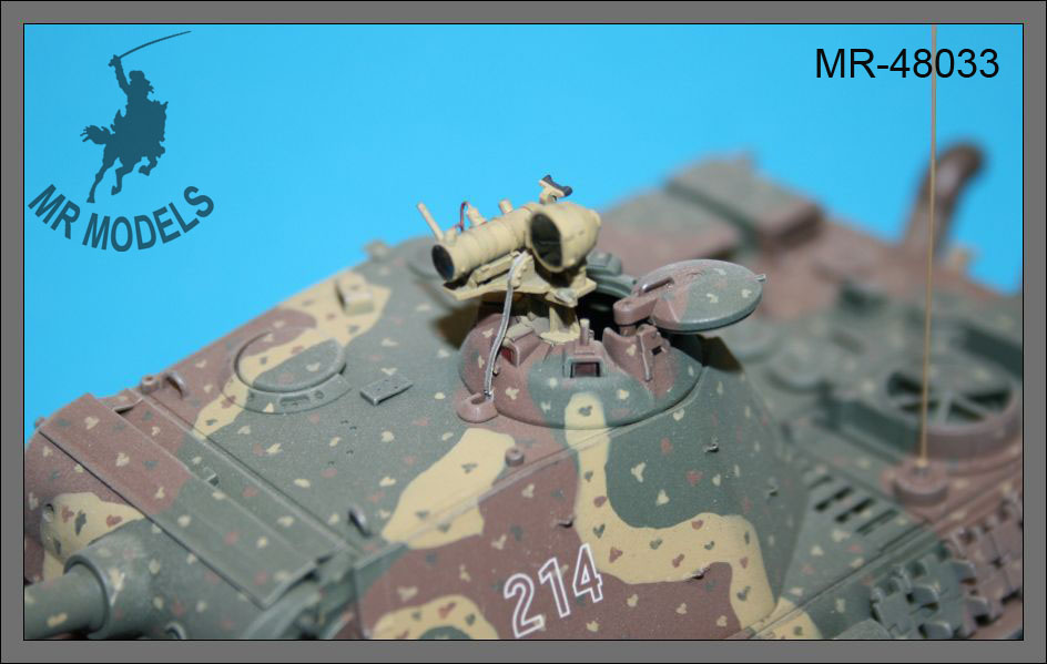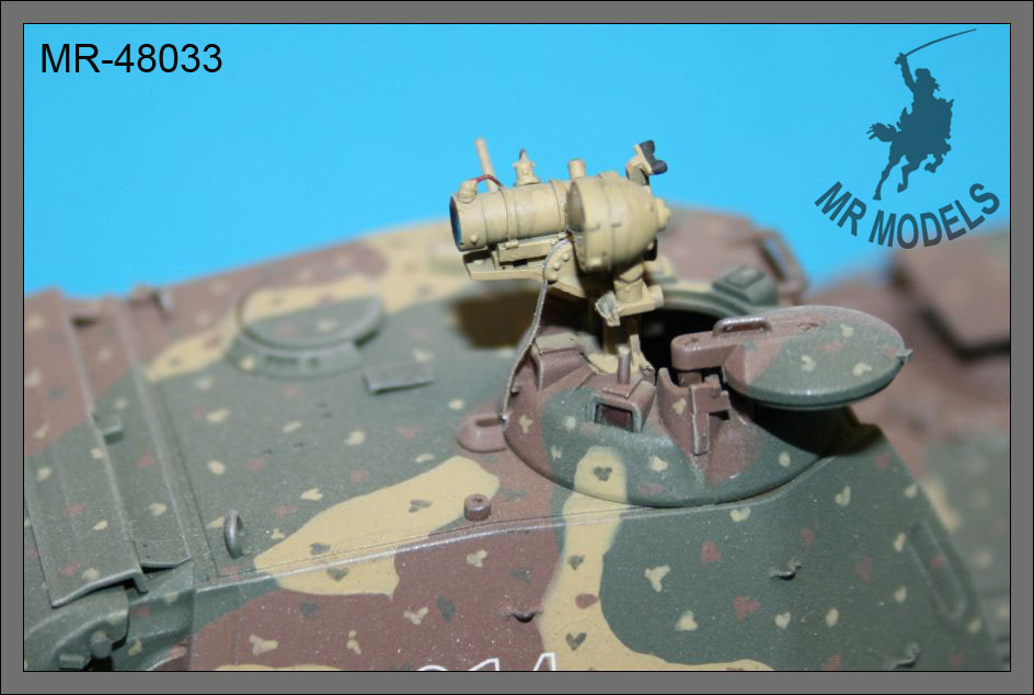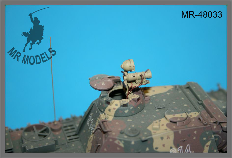 Das Set MR-48033 von MR Modellbau beinhaltet zwei präzise gefertigte Infrarot Bildwandlergeräte im Maßstab 1:48, passend für den Panther G. Diese Zusatzgeräte wurden im späten Zweiten Weltkrieg zur Nachtsicht eingesetzt und sind ein wichtiges Ausstattungsdetail für eine realistische Modellnachbildung. Das Set eignet sich perfekt als Ergänzung für den TAMIYA Panther G Bausatz.